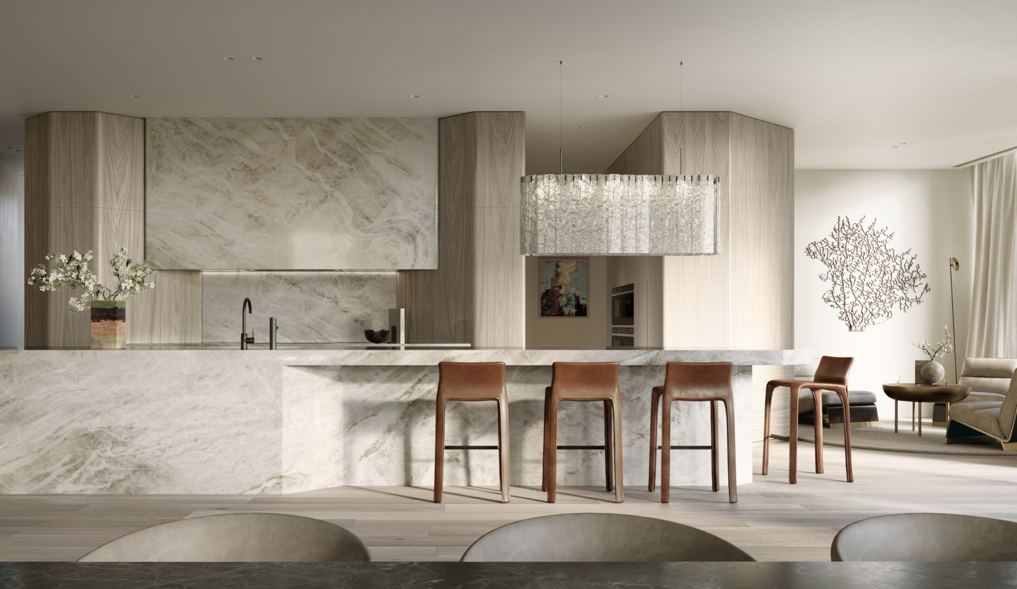 At the heart of each penthouse lies a grand kitchen, complete with stone bench tops, premium appliances, and hidden walk-in sculleries and wine rooms, all designed for both functionality and elegance.